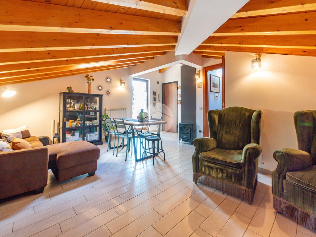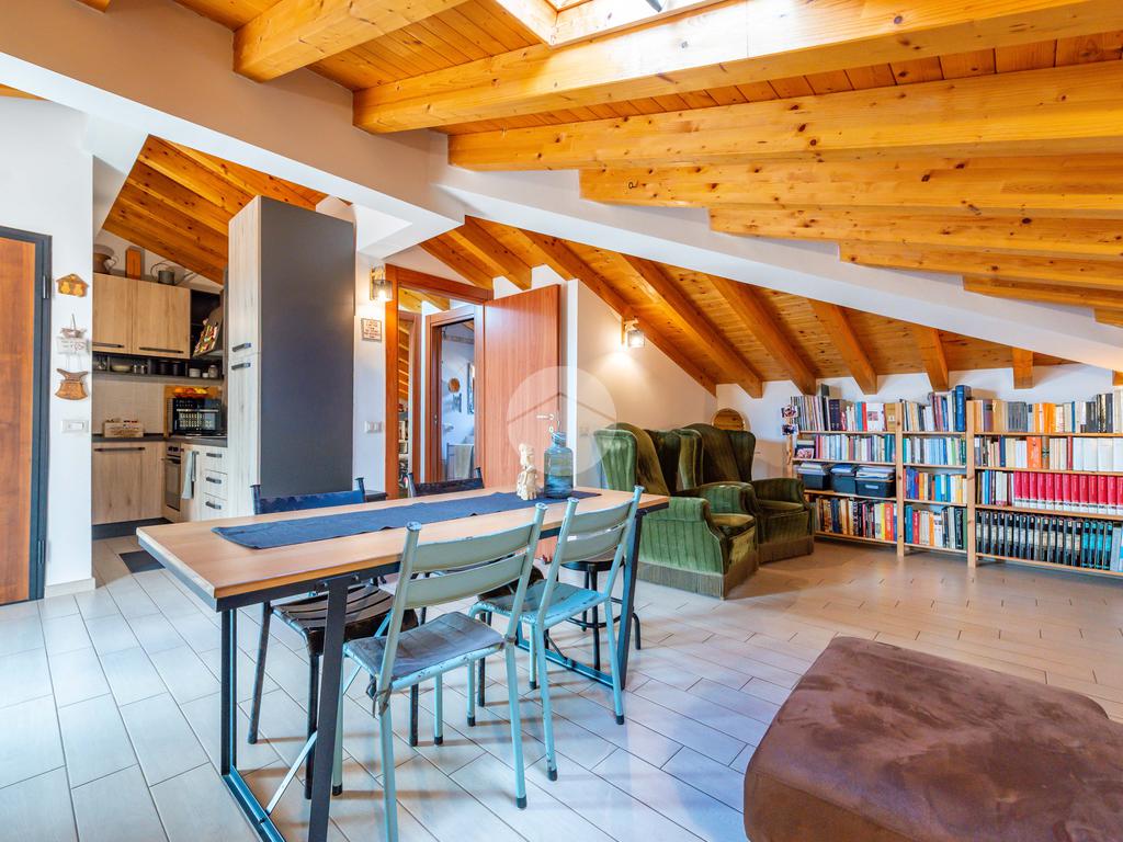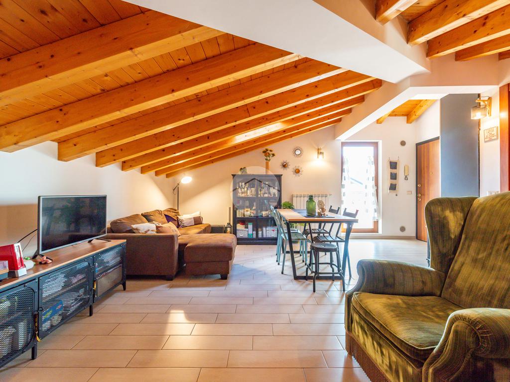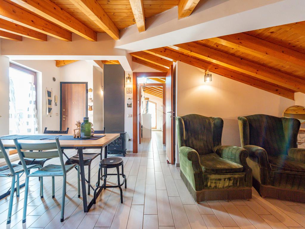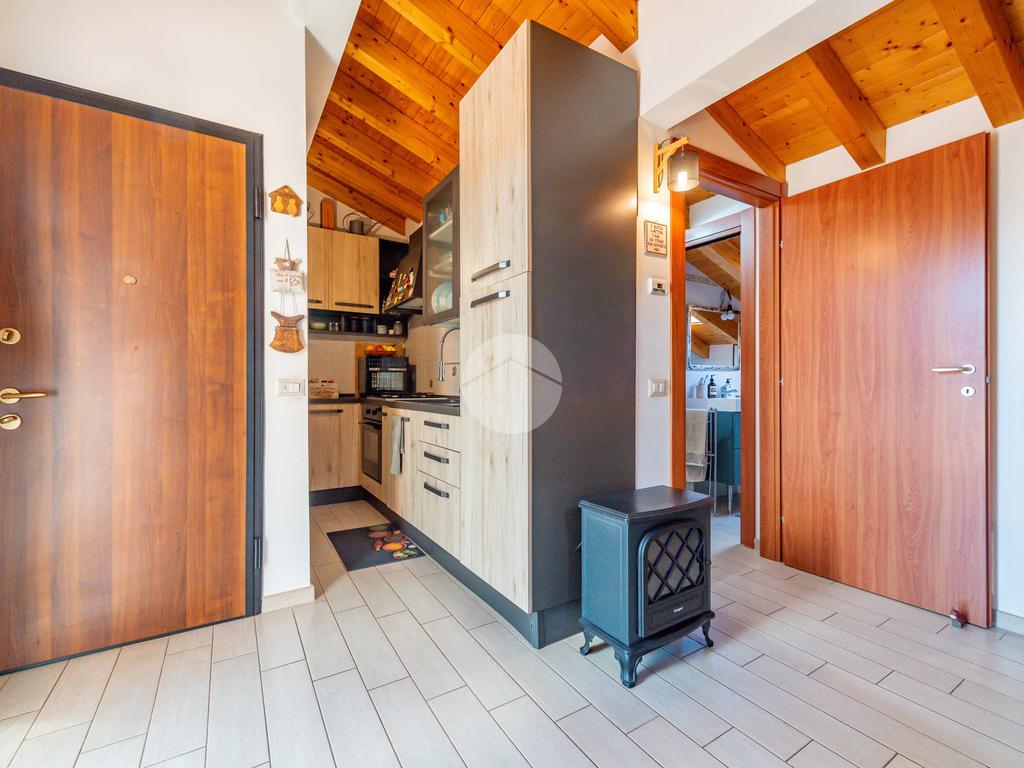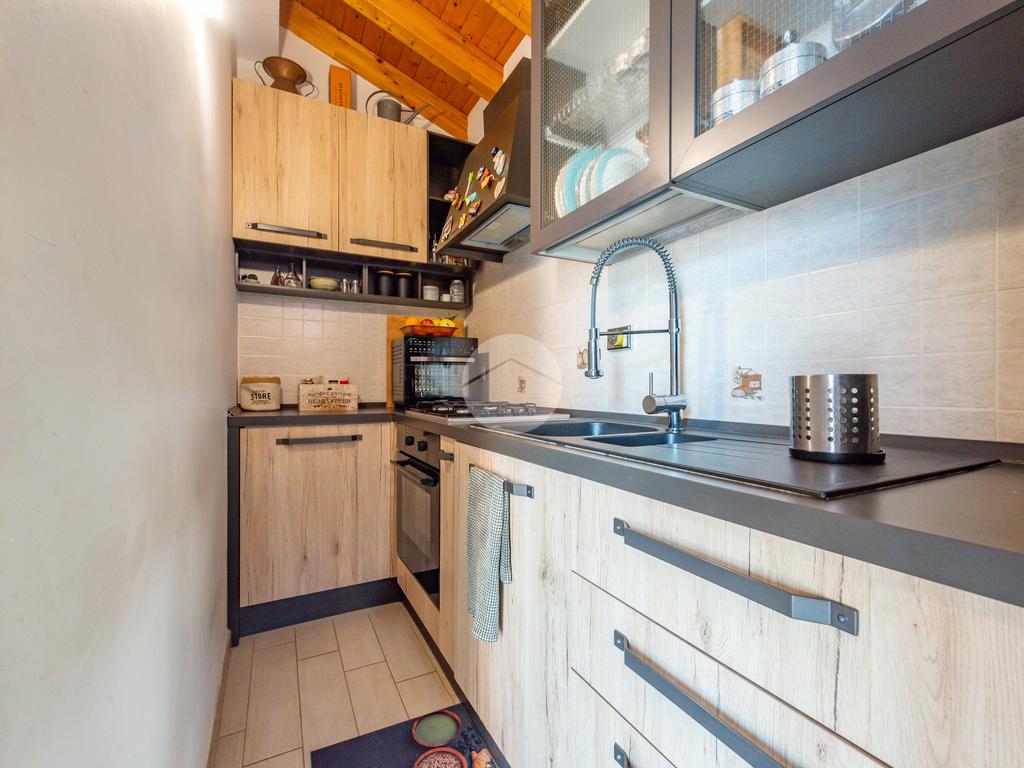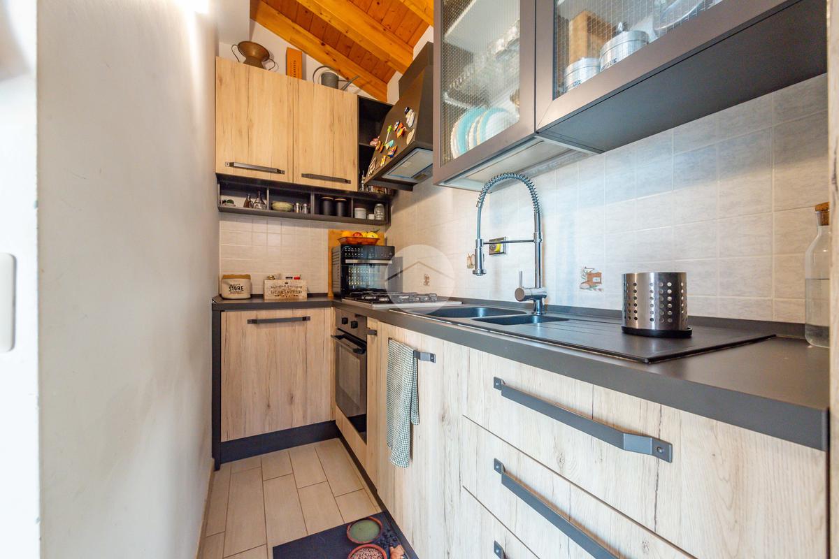L’ingresso si apre su un soggiorno accogliente con cucinotto a vista, una soluzione pratica e moderna che valorizza gli spazi.